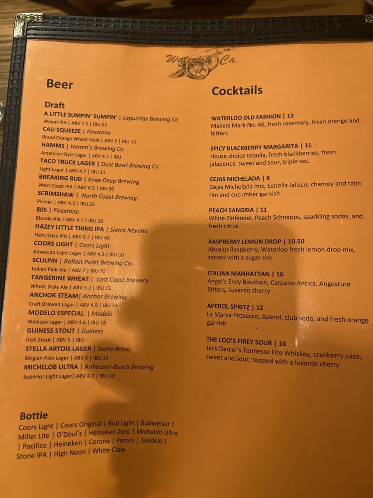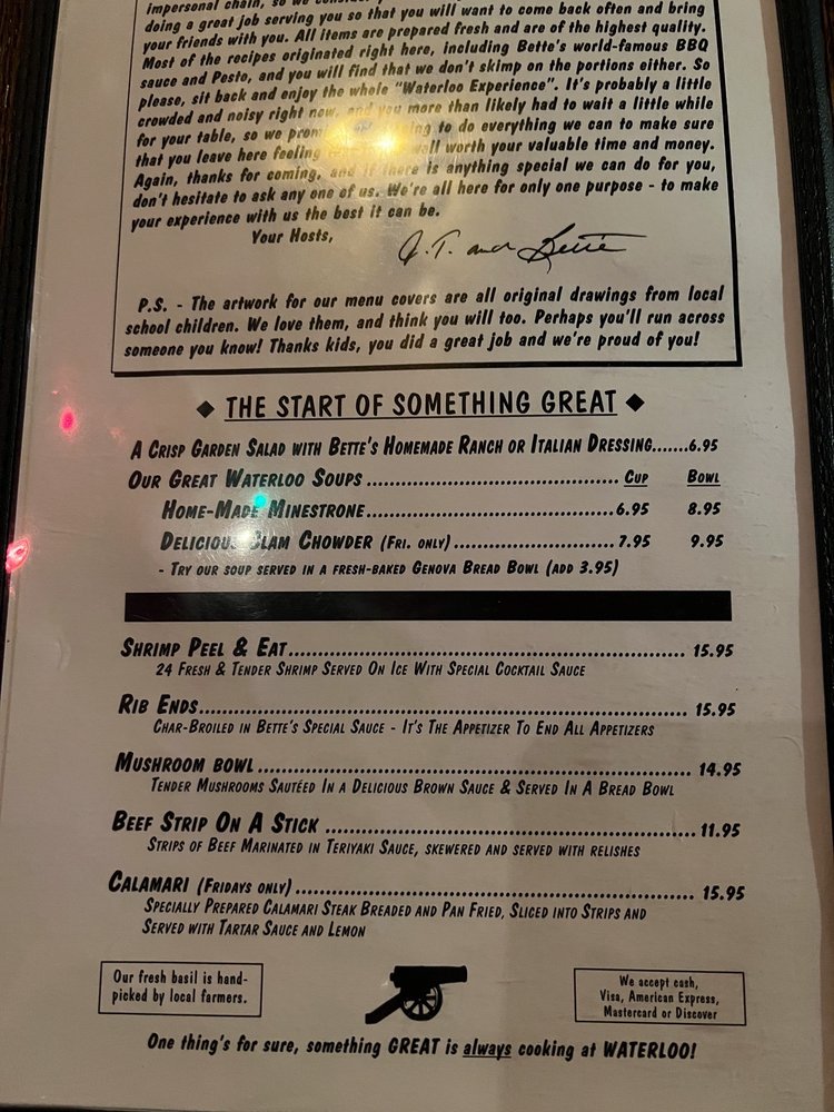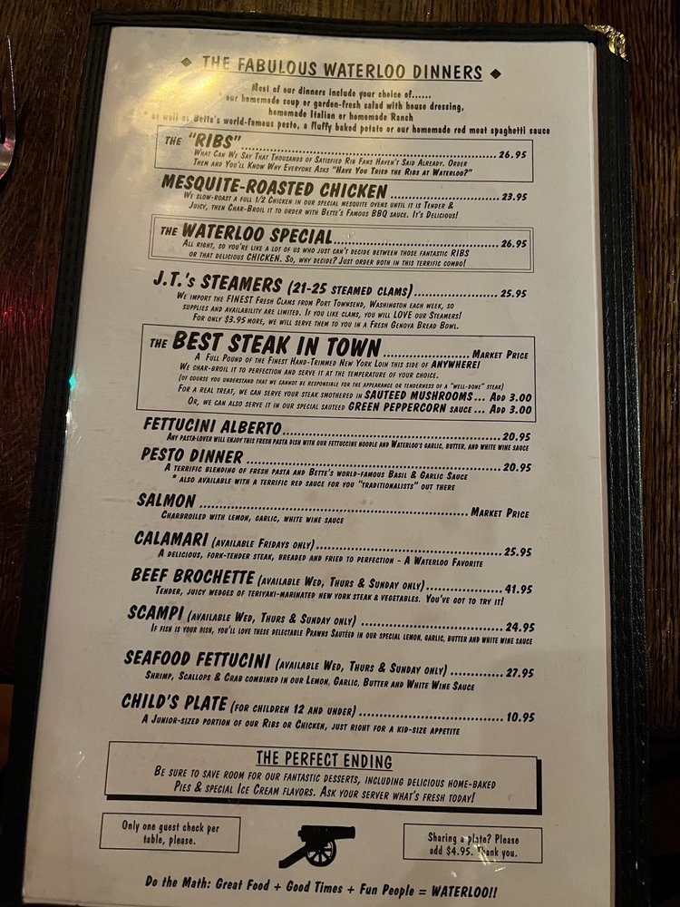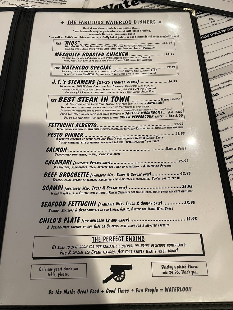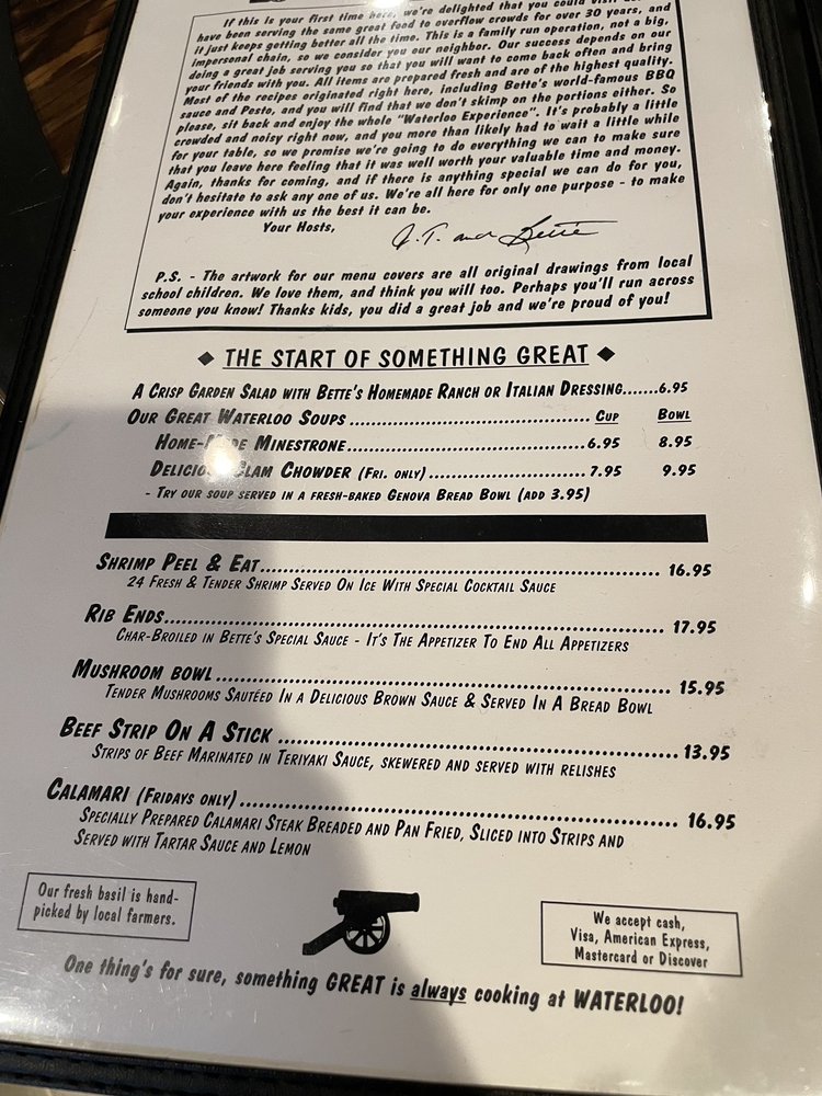 Introducing the menu at Waterloo CA, a popular restaurant located in Stockton, CA. This casual dining spot offers a variety of dishes with a focus on steaks, ribs, pasta, and seafood. Customers rave about the quality of food and friendly service, making it a go-to spot for many. Noteworthy menu items include the pesto pasta, prime rib sandwich, and pork ribs with a sweet and tangy sauce. The cozy atmosphere with a cowboy vibe and attentive staff add to the dining experience. Make sure to check out their extensive menu featuring many vegetarian options and don't miss the coconut cream pie for dessert. Waterloo CA is a must-visit for those looking for a satisfying meal in a welcoming setting. Make reservations in advance for larger groups to ensure a table at this bustling restaurant.